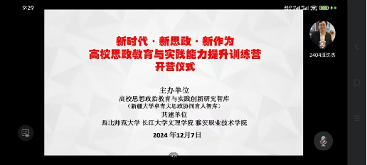 12月7日,“新时代 新思政 新作为—高校思政教育与实践能力提升”训练营以腾讯会议形式正式开营,Beat36533名辅导员和学工部老师参加。本次训练营由高校思想政治教育与实践创新研究智库(新疆大学卓青大思政育人智库)举办,吸引了150所高校325名老师参与,旨在学习贯彻党的二十届三中全会和全国教育大会精神,探索思政教育新路径,提升教育工作者的实践能力和创新能力。