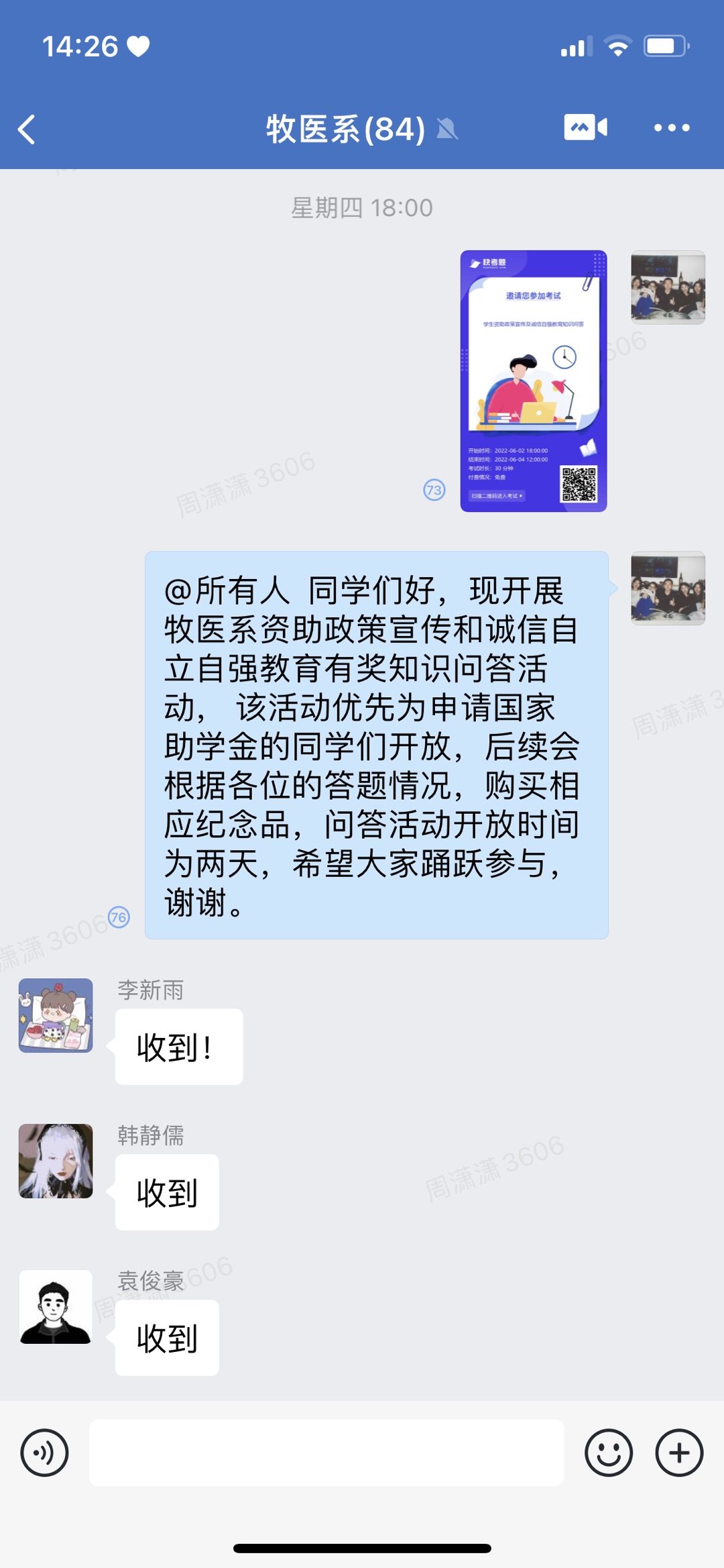 为大力宣传北京市中、高职学生资助政策,并对学生进行诚信自立自强教育,畜牧兽医系于2022年6月2日至2022年6月4日,面向系部内申请国家助学金的同学开展“资助政策宣传和诚信自立自强教育有奖知识问答活动”,该活动共计70名学生参加,根据问答比赛成绩评选出获奖名单,一等奖6人,二等奖19人,三等奖36人,参与奖9人。