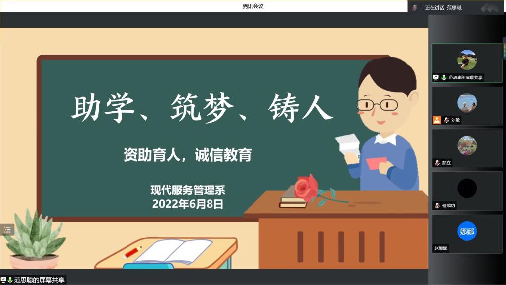 现代服务管理系于6月8日晚召开“助学、筑梦、铸人”资助诚信教育主题活动。由辅导员范老师和系优秀资助学生代表共同参加本次活动。