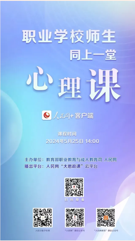 为推动加强和改进职业学校心理健康工作,培育学生积极心理品质,教育部职成司会同人民网制作了“职业学校师生同上一堂心理课”视频,将于“5·25”全国大中学生心理健康日(周六)14:00上线。