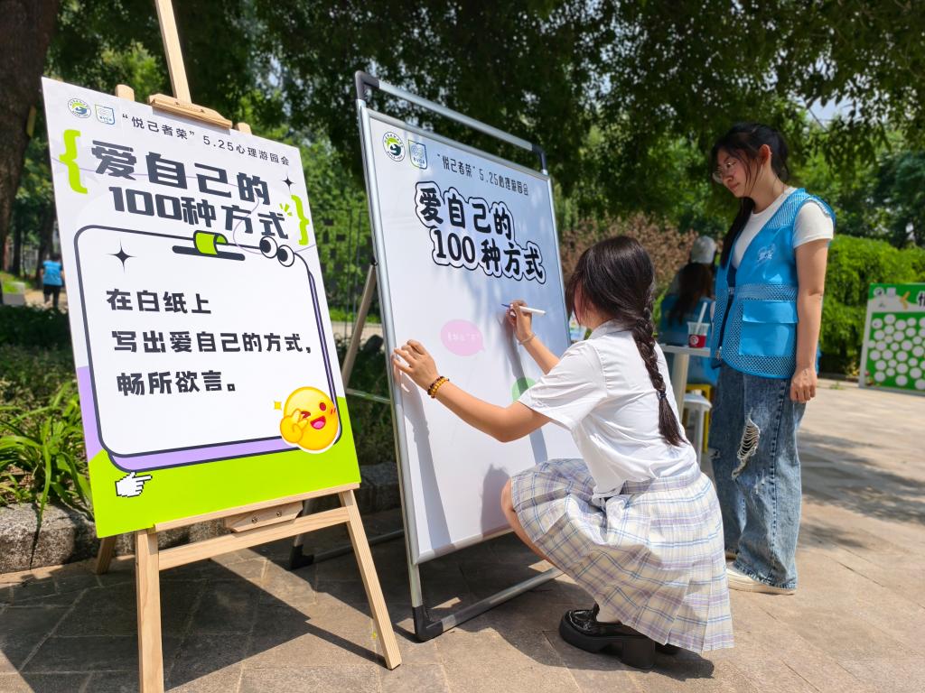 游园志愿活动让我深刻体会到“悦己者荣”的意义,无论是引导同学们在“情绪脸谱”上绘出心声,还是在“心灵钓愈”摊位为参与者加油计时,每一个细节都充满温暖。看到大家专注地写信给未来的自己,或笑着与草莓熊拥抱时,真切感受到活动传递的疗愈力量。志愿者不仅维护秩序、守护安全,更用无声的陪伴支持着每一份表达。希望未来能继续参与这样有意义的活动,让更多人通过互动与倾诉,找到内心的光。