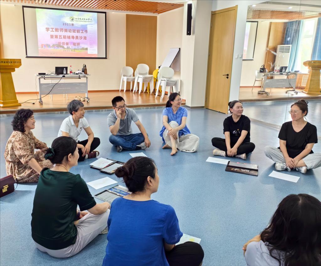 2025年7月4日上午,学工队伍舞动赋能减压工作坊暨第五期辅导员沙龙在长阳校区心理素质发展与指导中心成功举办。北京舞蹈学院人文学院副教授、中德舞动治疗师赵妍给大家带来了一场别开生面的心灵之舞的培训。活动通过五律舞蹈、绘画分享、双人舞动、单人舞动等多个环节,为参与者提供了一次释放压力、探索自我、回归心灵的舞动疗愈体验。