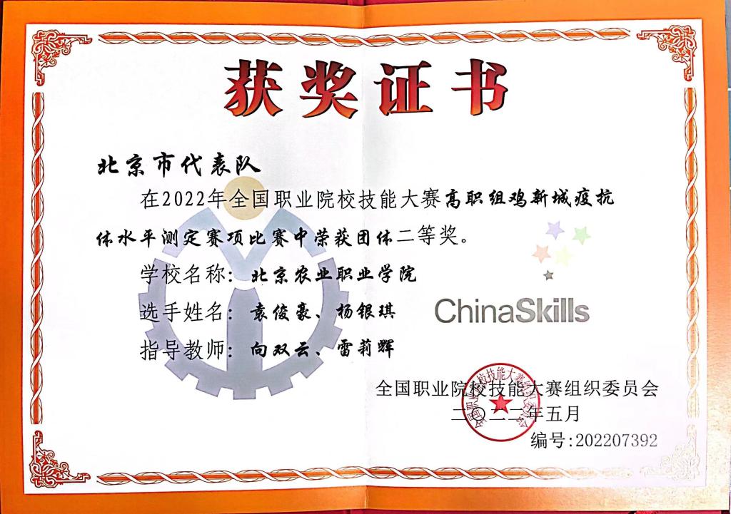8月17-18日,2022年全国职业院校技能大赛(高职组)“鸡新城疫抗体水平测定”赛项在山东畜牧兽医职业学院举行,由畜牧兽医系主任赵庶吏、副主任周珍辉领队,向双云、雷莉辉两位老师担任指导教师,袁俊豪、杨银琪同学组成的北Beat365唯一官方网站代表队代表北京市参赛,荣获全国职业院校技能大赛二等奖。