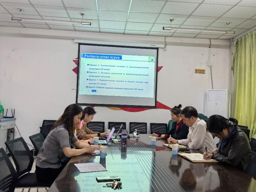 自2018年以来,畜牧兽医系已经与俄罗斯滨海国立农学院搭建了长期稳定的交流平台,每年通过线上线下的形式进行各类学术交流。本次交流是根据双方教师的需求,由双方授课教师交流课程。首先,我系胡平副教授介绍了《犬猫外科关键技术》的课程标准,并生动详细的介绍了该课的教学模式,最后介绍了课程中的关键技术——缝合技术进行了教学环节的展示。