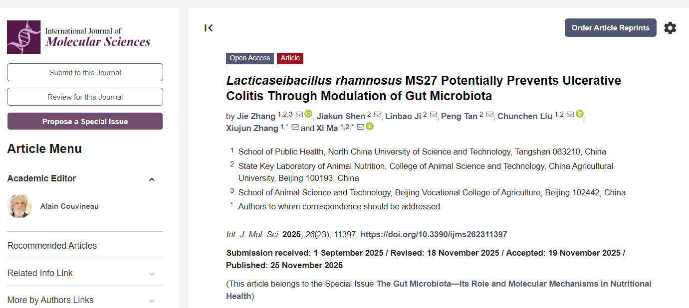 近日,动物科技学院教授张洁在国际期刊《International Journal of Molecular Science》——营养与健康分子机制专刊,发表了题为“Lacticaseibacillus rhamnosusMS27 Potentially Prevents Ulcerative Colitis Through Modulation of Gut Microbiota”的研究型论文。论文探究了新型鼠李糖乳杆菌MS27的预防性补充对缓解溃疡性结肠炎的作用及潜在机制。