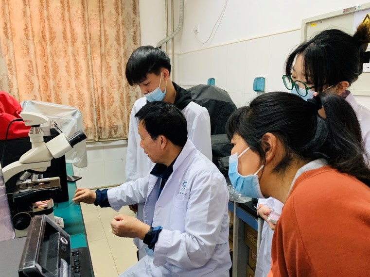校园升级管控后,学生的大赛指导老师或小区封控,或家里孩子小离不开无法进驻校园指导,曹金元教授主动承担起重任,进驻校园指导学生备赛,已经与学生朝夕相处近20天。每天,曹老师都到实验室指导学生实验仪器操作,帮助纠正和巩固操作手法,规范技术和步骤要领。疫情管控,外面采购的实验用鸡无法进入校园,曹老师协调联系后勤管理处领导,带领学生们到人工湖去采集大白鹅和灰鸭子的血,保证了学生血液红细胞实验操作需求。周振辉、向双云、雷莉辉、关文怡等老师在校外利用线上视频方式指导训练,全程查看学生们的操作细节,做好理论知识点的讲解点评,不断锤炼备赛的每一个细节。
