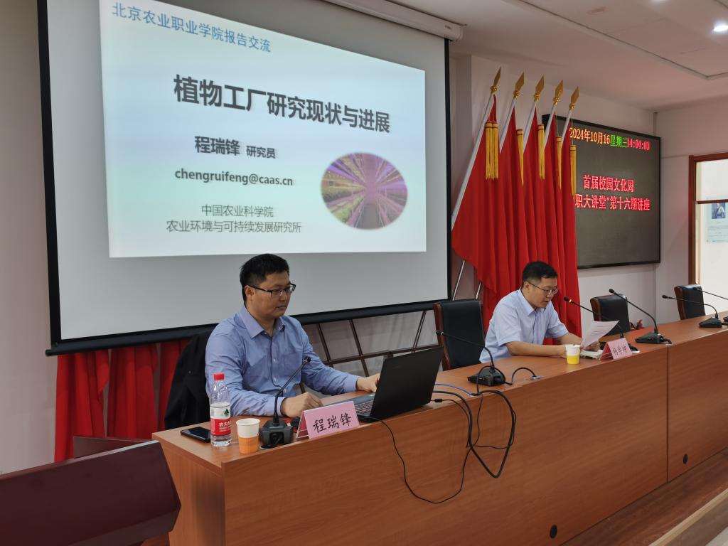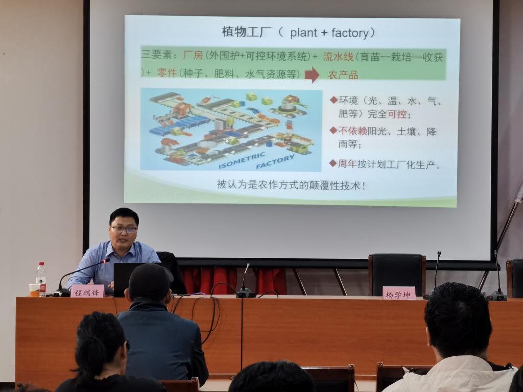 本次活动邀请中国农业科学院农业环境与可持续发展研究所程瑞峰主任就“植物工厂研究现状与进展”作主题报告。程主任以植物工厂的概念为切入点,从植物工厂的特征与发展意义、植物工厂现状、关键技术进展、未来发展趋势等方面进行了介绍,报告采用了大量详实数据和生动案例对植物工厂进行了全方位深入浅出的讲解,特别是结合我国智慧农业发展政策、发展方向和发展路径,就植物工厂在关键技术进展、未来发展规划等方面进行了充分的论证。报告内容丰富、旁征博引,对于智慧农业工程学院将来在现代农业、设施农业方面更好地把握时代发展契机、推进专业实训室建设、开展校企合作等方面具有很强的指导性。会后,部分教师就现代农业实训室建设、校企合作等内容与程主任进行了沟通交流。