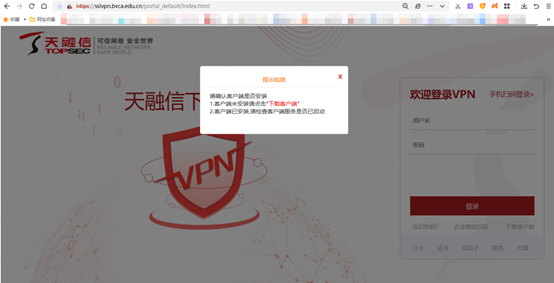 VPN访问地址:https://sslvpn.bvca.edu.cn/如浏览器提示证书安全问题,请忽略后继续访问。