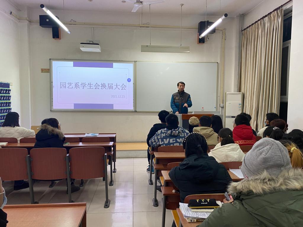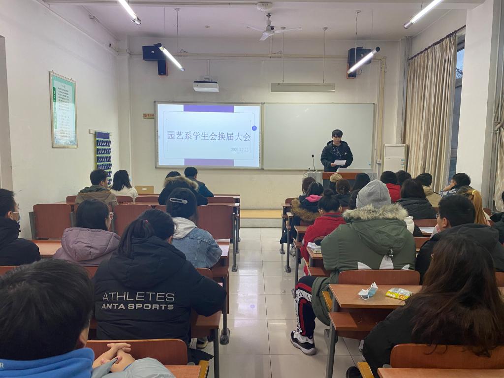 2021年12月23日下午五点,园艺系学生会换届大会在教学楼201教室顺利召开。园艺系学生工作办公室主任赵钢、辅导员张静、冯梦珂、董炳辰老师出席此次大会。参加此次大会的还有学生会主席张博达、副主席武雨琛以及来自各班级的候选人和相关部门人员。