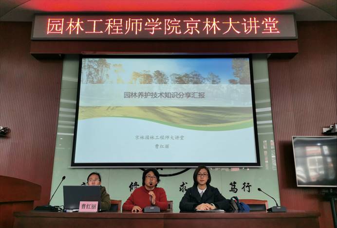 2021年12月21日,园艺系园林工程师学院京林大讲堂在旧综合楼报告厅开讲。园艺系副主任吴晓云、园林专业主任李玉舒、北京京林园林集团有限公司培训部经理曹红丽和园艺系园林技术专业全体师生参加。