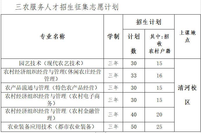 本着资源共享,合作兴农,产学融合的多元规划,拟定向招录具有北京户口,具备北京市高考报名资格(取得普通高中或同等学历以上的考生),年龄在50周岁(含)以下的三农从业人员,学历为全日制大专。